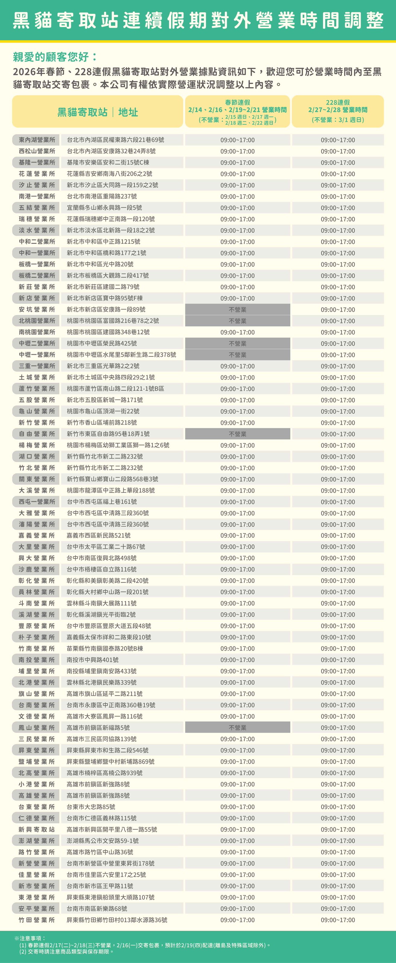 2026年春節、228連假營業站所營業時間公告